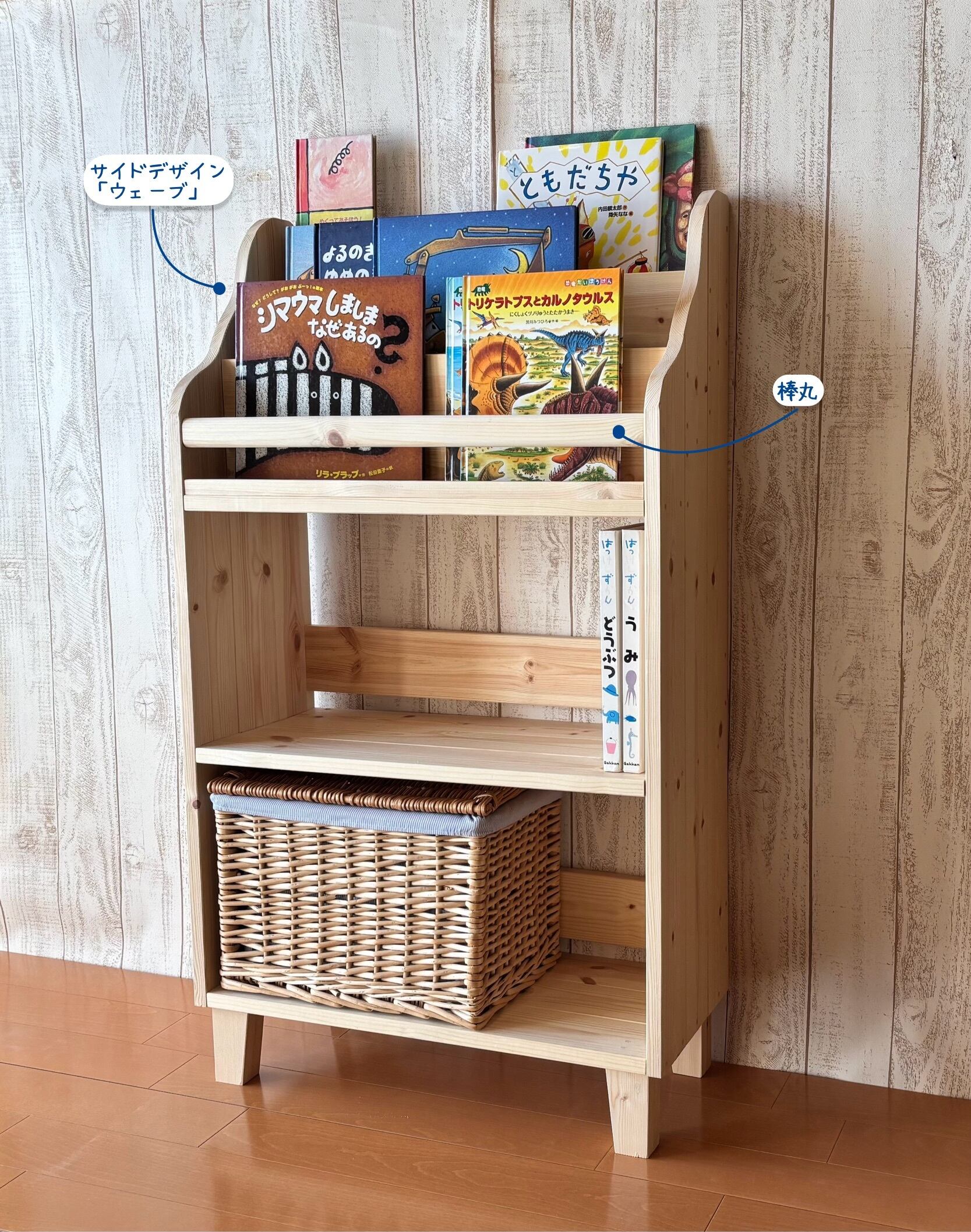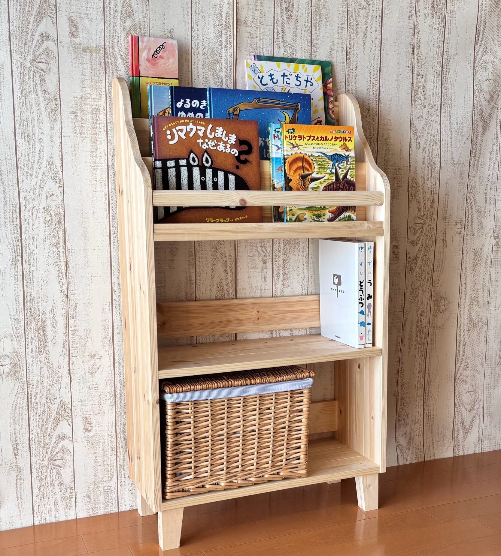 そんなお子様と本のお悩みを解決する、天然木製の優しい絵本棚!