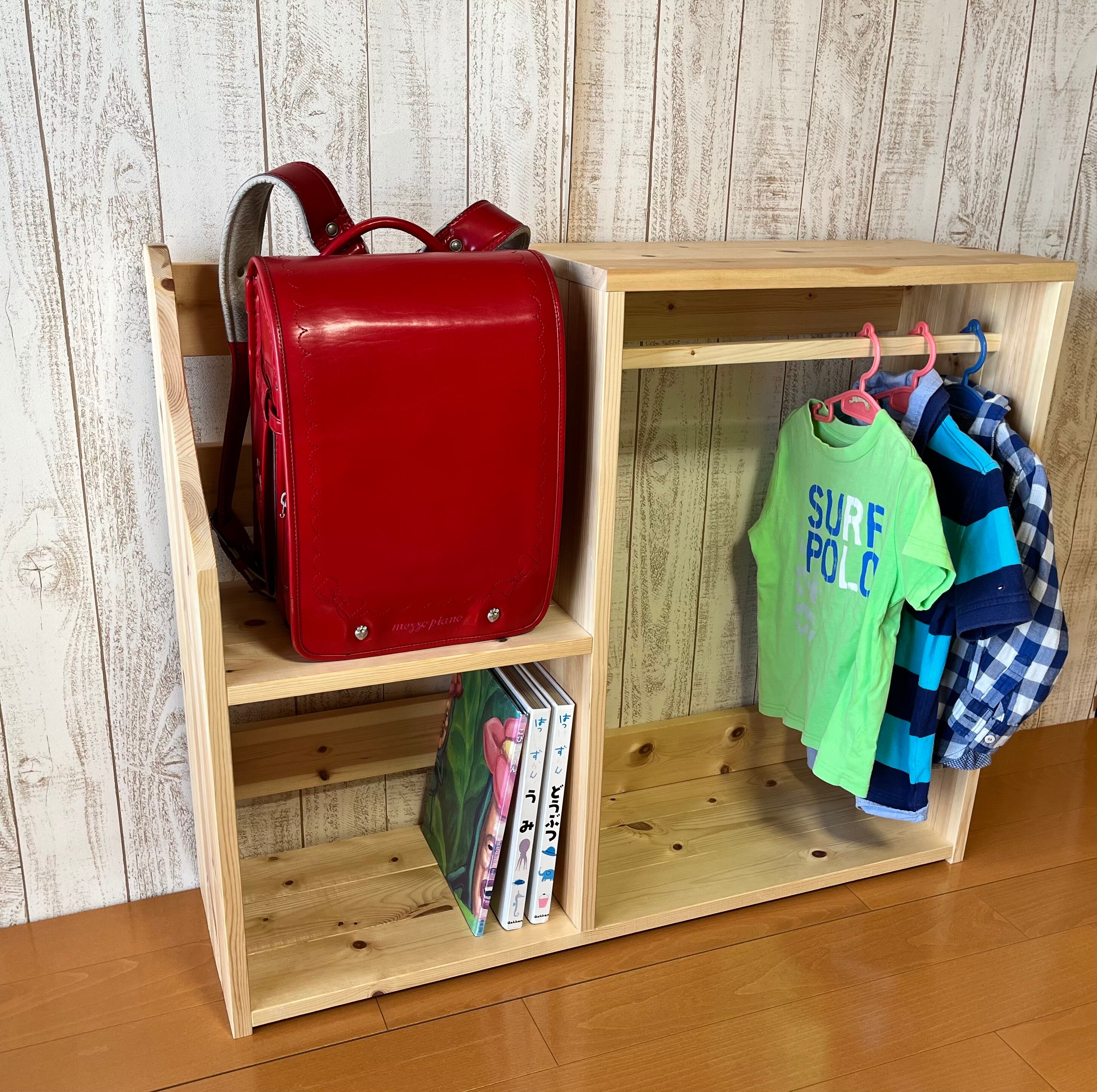 ✔ ランドセル置き、洋服掛け、収納棚がこれ1台に!