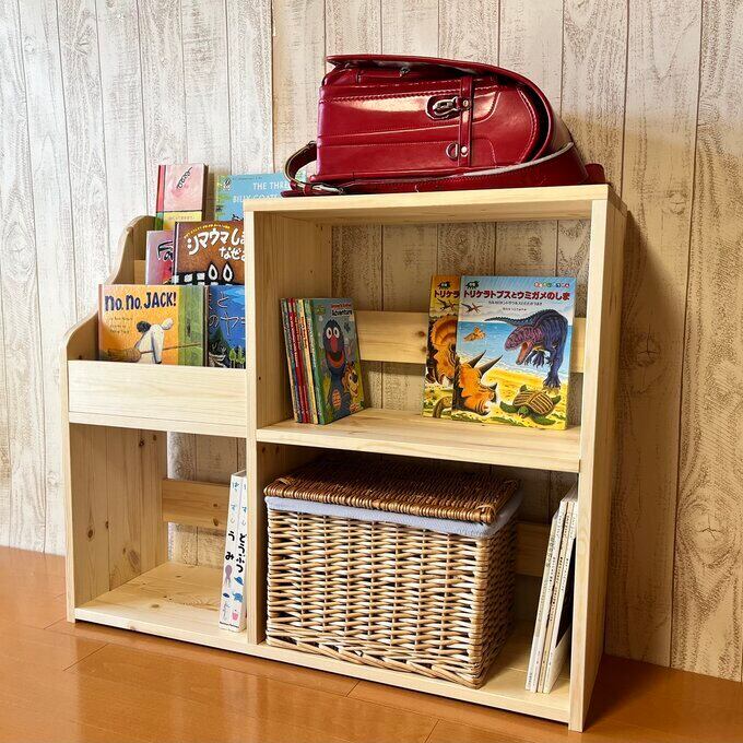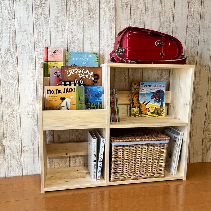 絵本棚・フリーラックとしてお好みに合わせ使用していただけると思います。本棚の上部は表紙を立てかけて置いて頂くことが出来、お子様が手に取りやすく、お気に入りの本を見つけやすいです。