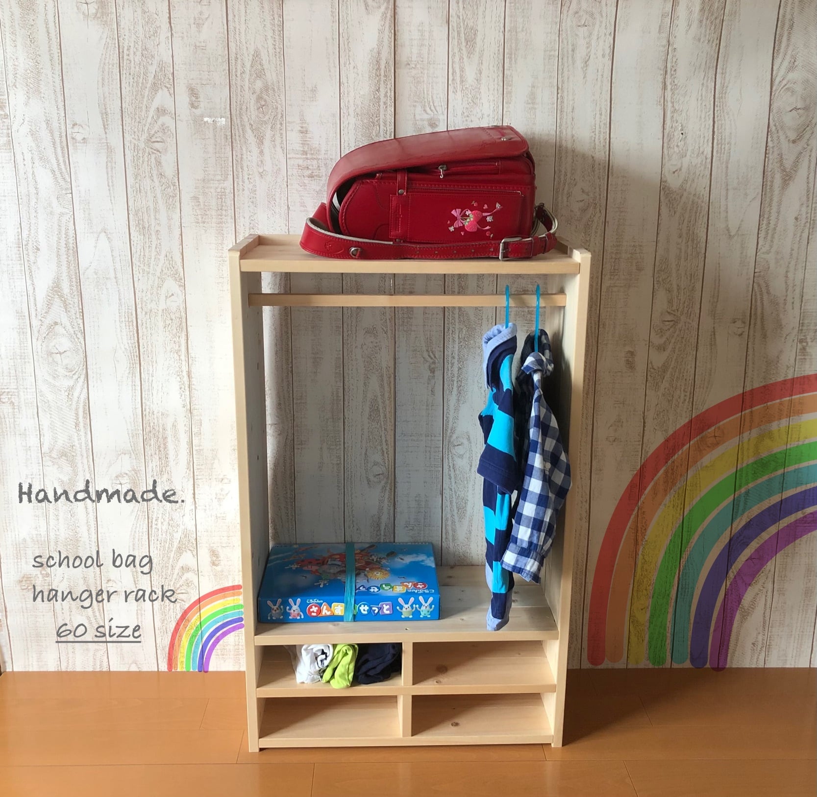 ランドセルラック・ハンガーラック・フリーラック(下段には、各9㎝の高さのスペースを設けましたので道具箱.上靴などお好みに合わせ使用していただけると思います。)